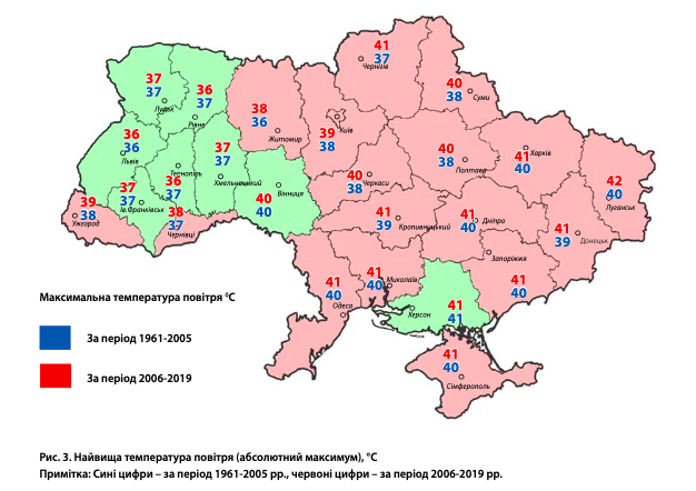 За розрахунками кліматологів середня швидкість потепління в Україні складає близько 0,4 °С за 10 років. Отже, за умови збереження таких темпів потепління вже через 30 років середня річна температура може підвищитися ще на 1-1,5 °С.