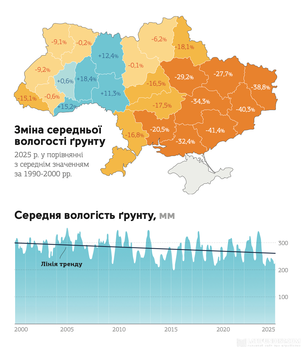 - Зменшення річної кількості опадів на 3% за останнє десятиріччя, що істотно знижує запаси вологи ґрунту та погіршує стан посівів.
