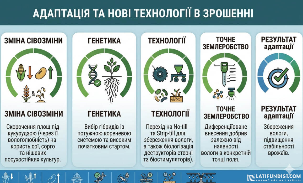 | Зміна сівозміни | Скорочення площ під кукурудзою (через її вологолюбність) на користь сої, сорго та нішевих посухостійких культур |