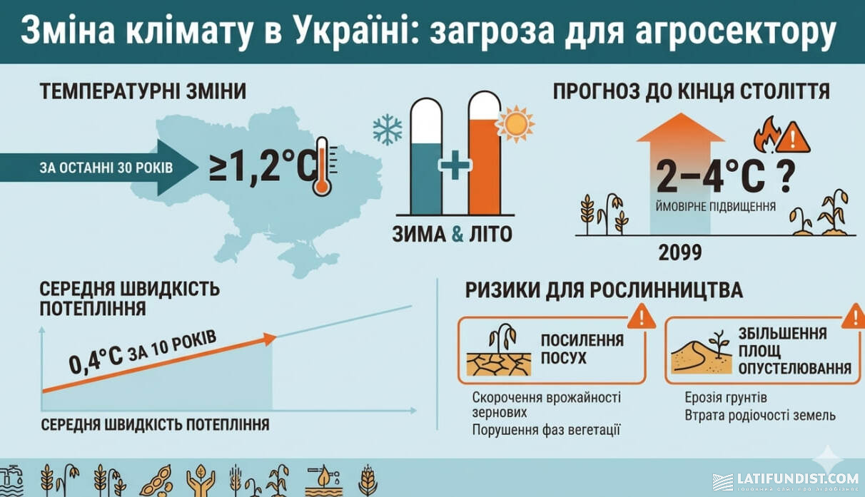 Середньорічна температура в Україні за останнє століття зросла на понад 1,5°C, причому темпи потепління у нас перевищують середньосвітові. Кожне десятиліття стає теплішим за попереднє через глобальне накопичення парникових газів та зміну циркуляції атмосферних мас. Це призводить до збільшення кількості днів з високими температурами, що викликає посухи та зменшення врожайності.
