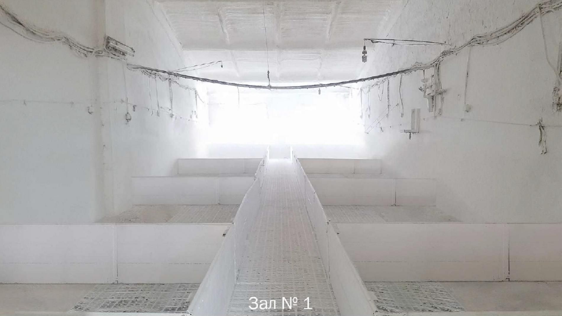 1.1 Зала 1: 20м х 7м, 140 кв.м, висота від 3м до 6м. Щілинна підлога - 60% площі, під підлогою каналізаційний вузол. 40% площі - тепла бетонна підлога (опалюється). Обладнана вентиляційною системою, рівномірний доступ до електроживлення та води, модульні перегородки.