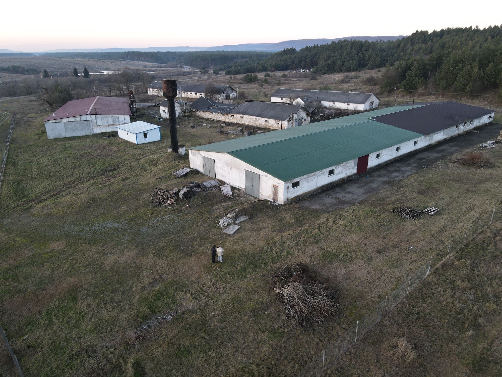 Пропонується ферма з двома основними будівлями: ангар із зеленим дахом площею 1402 м² та ангар з червоним дахом площею 1124 м².
