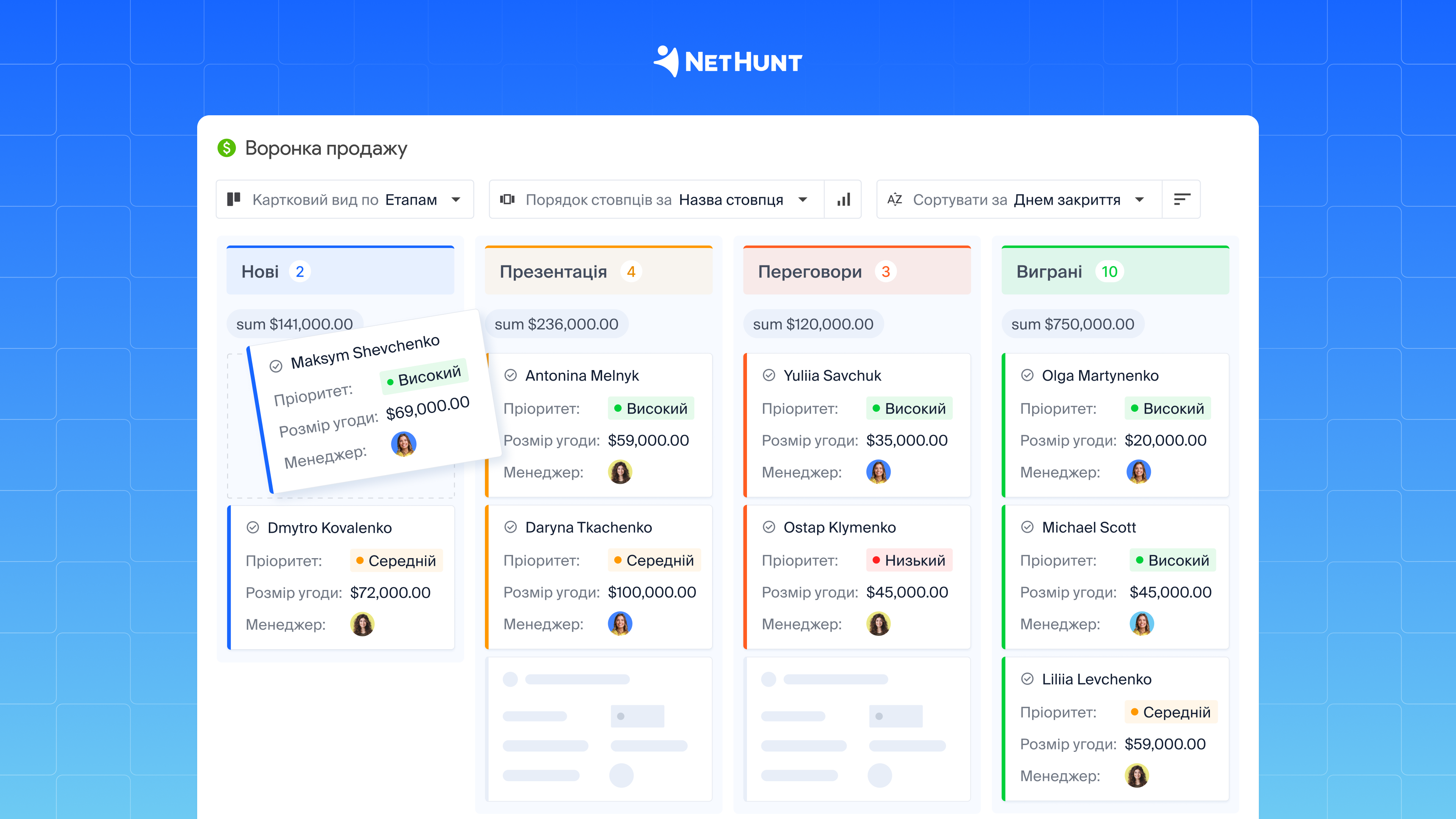 Саме на стику цих проблем агрокомпанії зазвичай і замислюються про CRM. NetHunt CRM у цьому випадку виступає не як «ще одна програма», а як робочий інструмент, що збирає закупівлю, продажі та логістику в одну систему. Розглянемо, як це працює на практиці.