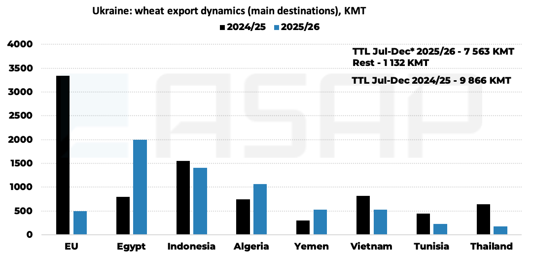 Найбільший удар припав на пшеницю. У липні–листопаді 2025 року експорт до ЄС скоротився до 490 тис. тонн проти 3,1 млн тонн роком раніше. Це означає, що цього сезону Україна змушена перенаправити близько 3–3,5 млн тонн пшениці на альтернативні ринки — завдання вкрай складне в умовах рекордного світового врожаю та надлишкової пропозиції.