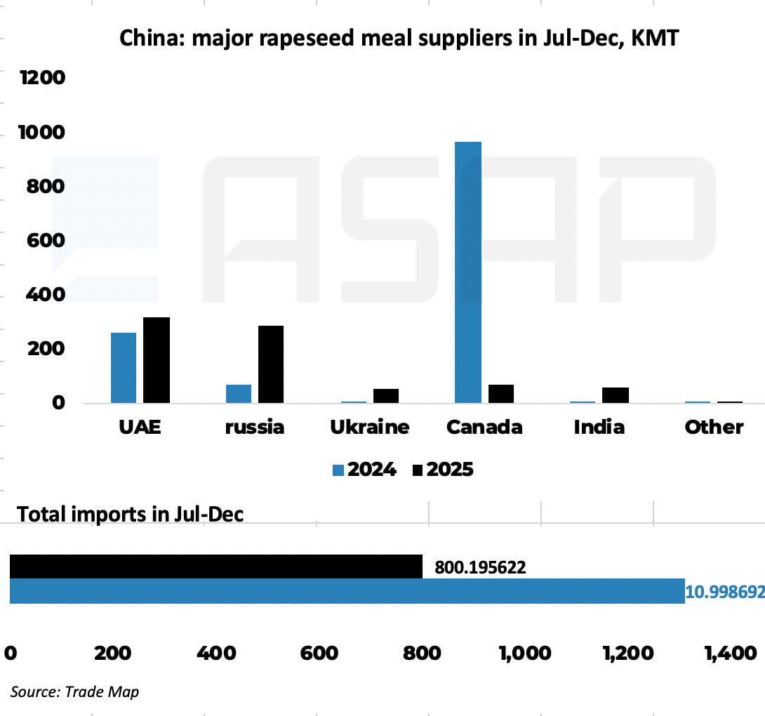 У сезоні 2024/25 Канада забезпечувала 66% китайського імпорту канолового шроту, ОАЕ та росія — 20% і 11% відповідно, тоді як Україна фактично була відсутня в цій статистиці. Китайський ринок був критично залежний від канадського продукту.