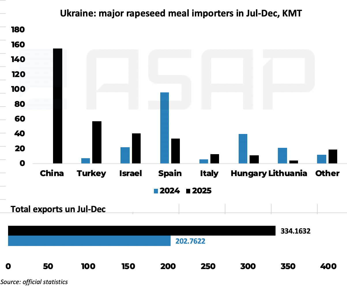 Низький урожай соняшнику змусив переробників шукати альтернативну сировину, щоб не зупиняти заводи. Ріпак став природною заміною. Додатково спрацювало й 10% мито на експорт насіння для посередників: більше ріпаку залишилося в країні та пішло в переробку. У результаті за липень–грудень Україна експортувала 334 тис. т ріпакового шроту проти 203 тис. т роком раніше.