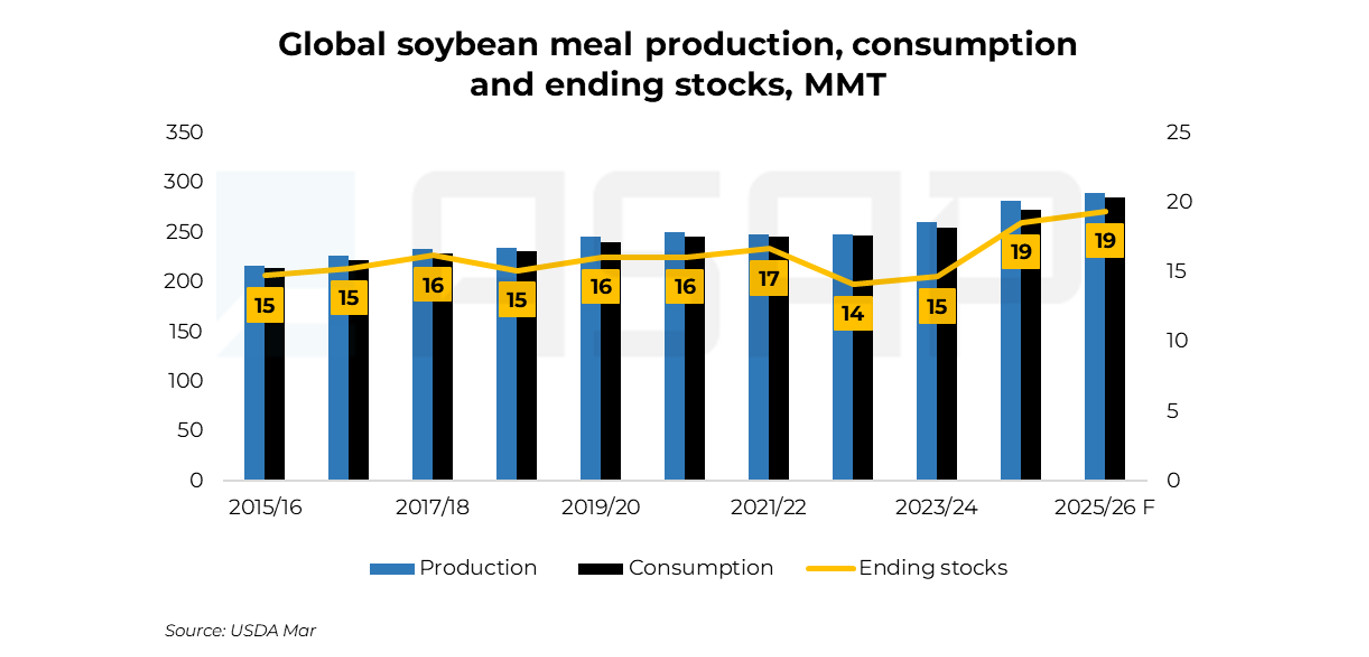 Global soybean crush has increased from around 276 MMT in 2015/16 to nearly 368 MMT in 2025/26, according to USDA estimates. Over the same period, soybean meal production rose from 216 to nearly 290 MMT, reaching a record high.