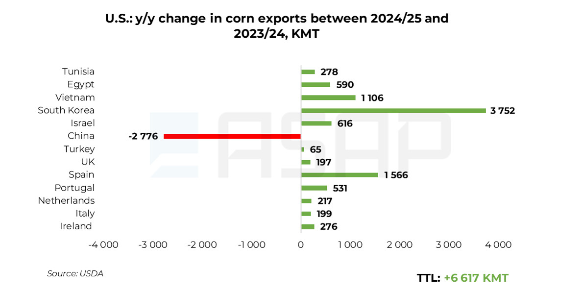 Between 2023/24 and 2024/25, on markets of direct competition, U.S. corn exports rose by 6.5 MMT, while Ukraine’s shipments declined by 7.5 MMT.