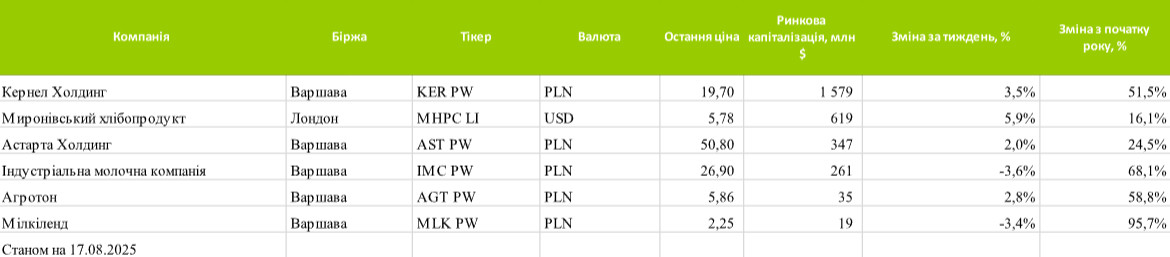 З 11 по 17 серпня курс акцій українських агрохолдингів на Варшавській і Лондонській фондових біржах переважно зріс.