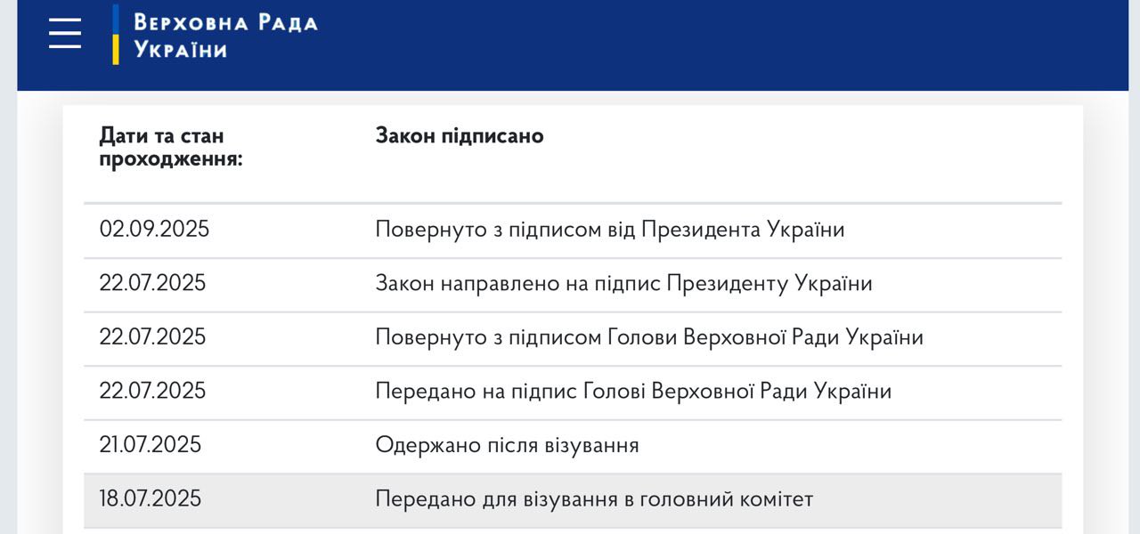Законопроєкт підписаний у вівторок, 2 вересня. Після підписання закону Президентом, він набирає чинності наступного дня після офіційного опублікування в газеті «Голос України» та у Відомостях Верховної Ради України. Його мають опублікувати протягом 15 днів.