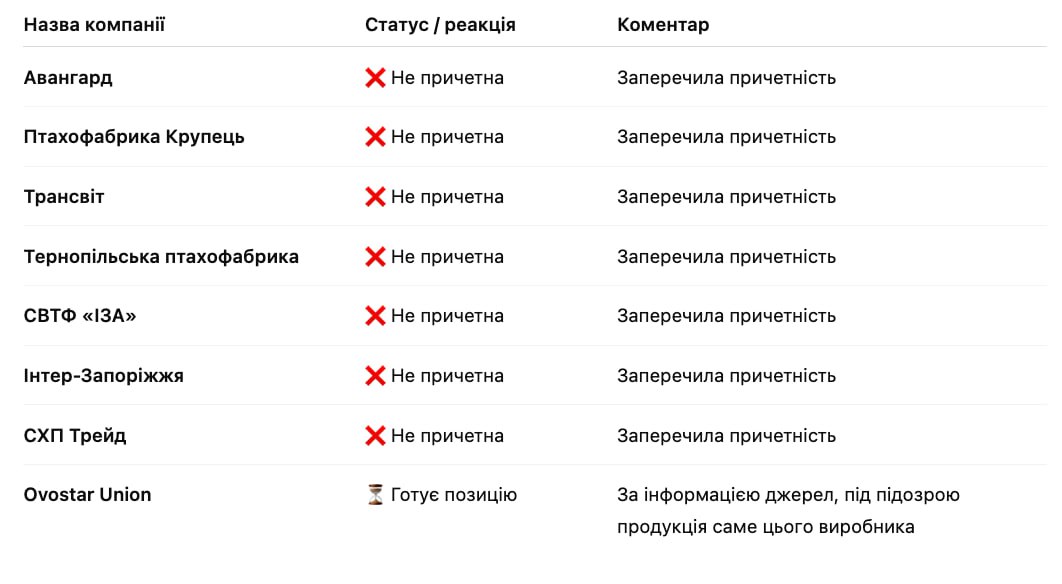 Редакція Latifundist.com відправила запити до вказаних учасників ринку. Заперечили, що мають відношення до інциденту: «Авангард», «Птахофабрика Крупець», «Інтер-Запоріжжя», «Трансвіт», «Тернопільська птахофабрика», «СВТФ «ІЗА» та СХП Трейд.