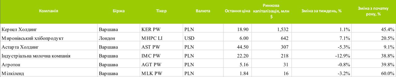 Минулого тижня котирування найбільших українських аграрних компаній, що торгуються на європейських біржах, продемонстрували змішану динаміку. Про це свідчать дані Eavex Capital.