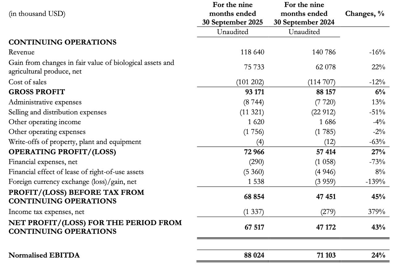 Виручка компанії за звітний період становила $118,6 млн, що на 16% менше, ніж торік. Водночас прибуток від переоцінки біологічних активів зріс до $75,7 млн (+22%).