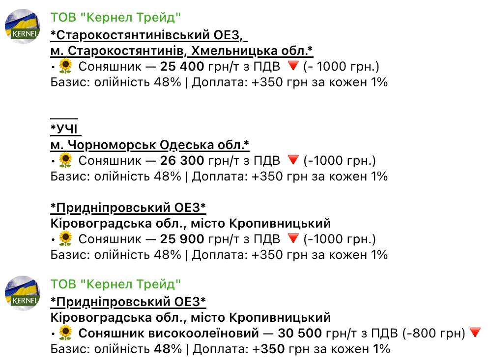 Розсилки з цінами ОЕЗів «Кернела» та Sunpro в Березанці Миколаївської області. (Джерело Latifundist.com).