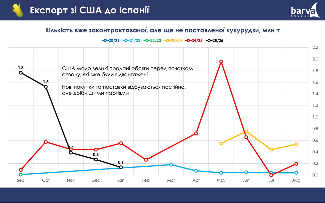 За даними минулого року, у період з січня по березень США поставили до Іспанії близько 1,3 млн т кукурудзи, однак ці обсяги формувалися дрібними щотижневими партіями. У разі запровадження мит під ризиком може опинитися лише 300–400 тис. т, а не весь обсяг.