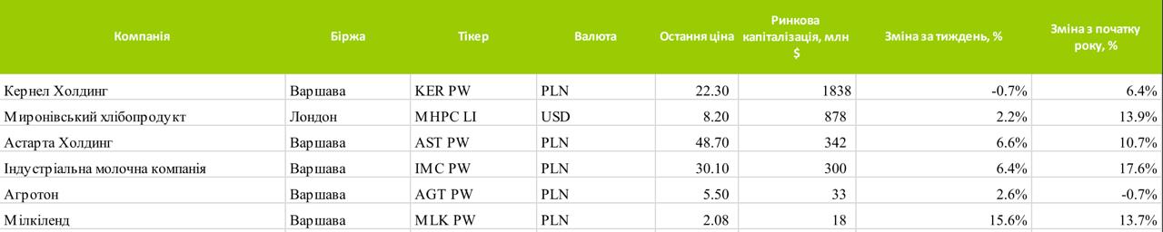 Позитивну динаміку також показали ІМК (+6,4% за тиждень, +17,6% з початку року) та «Агротон» (+2,6% за тиждень).