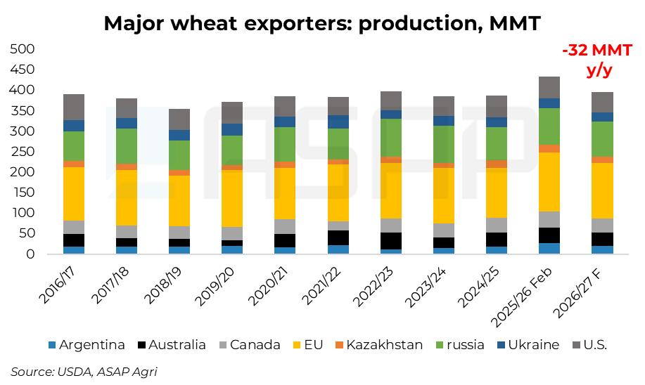 У ЄС після близько 144 млн т ринок закладає корекцію до 135–138 млн т на тлі нормалізації врожайності та слабкої цінової рентабельності культури. В Аргентині очікується більш стриманий результат на рівні 21–23 млн т, тоді як Австралія може повернутися до 32 млн т. Казахстан після врожаю близько 19 млн т також може показати зниження до 15 млн т.