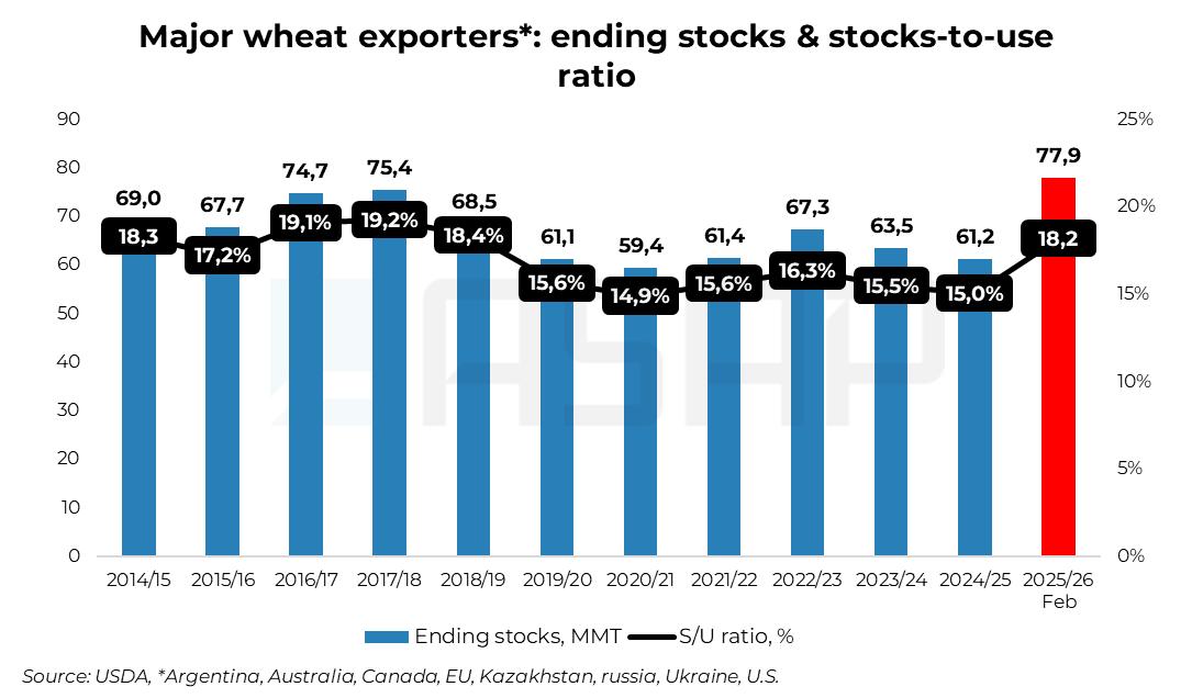 Сезон 2025/26 є більш ніж комфортним для ринку пшениці. Світове виробництво досягло рекордних 842 млн т, перехідні залишки високі, а співвідношення запасів до споживання у ключових експортерах — США, Канаді, Австралії, Аргентині, ЄС, росії, Україні та Казахстані — становить близько 18%.