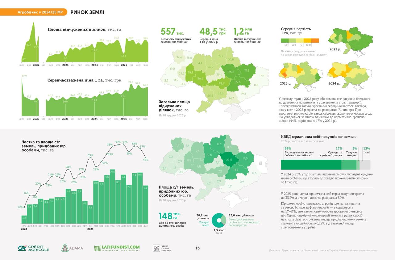 Лідером за кількістю укладених угод є Сумська область, де продано понад 32 тисячі земельних ділянок. Також серед регіонів із найбільш активним ринком — Полтавська та Чернігівська області. Найменше угод зафіксовано у Волинській, Рівненській та Запорізькій областях.