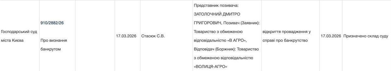 Згідно інформаційного портала «Судова влада України» 17 березня 2026 року «В АГРО» (Аріста) звернулась до Господарського суду м. Києва із заявою про порушення справи про банкрутство відносно «Волиця-Агро».