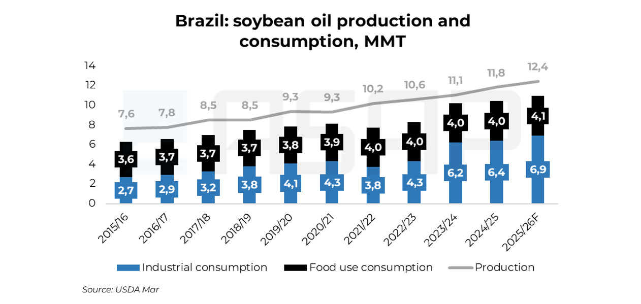 Попри одну з найбільших у світі переробних галузей, внутрішнє промислове використання соєвої олії (включно з біодизелем) залишається обмеженим — близько 1,4 млн т у 2025/26 сезоні. Для порівняння, у 2016–2017 роках цей показник перевищував 2,5 млн т.