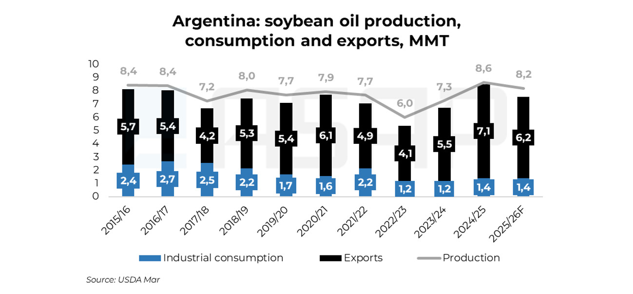 У результаті близько 70% виробленої в Аргентині соєвої олії продовжує експортуватися. Це підтримує позиції країни як одного з ключових глобальних постачальників, але водночас обмежує розвиток внутрішнього біодизельного сектору.
