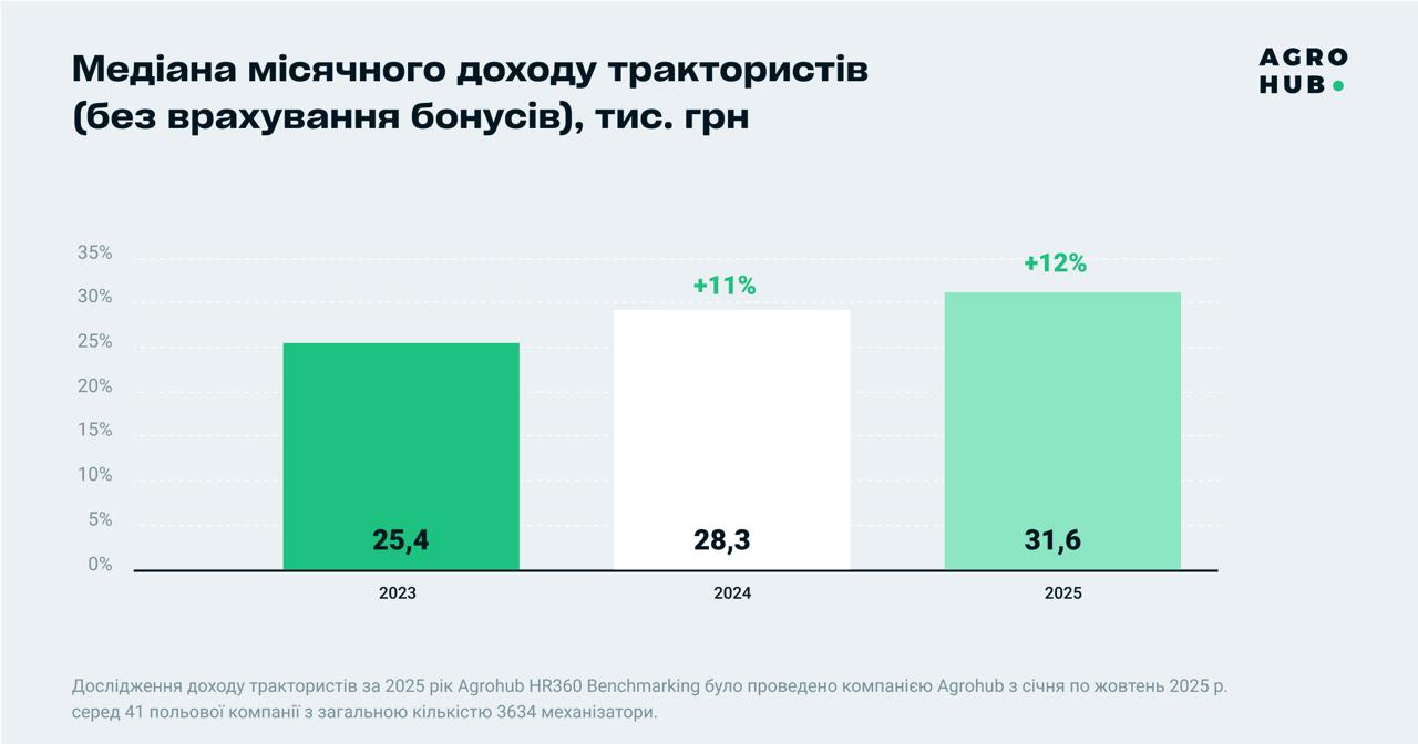 Загальний місячний дохід трактористів (без урахування бонусів) зріс до 31,6 тис. грн, що майже на 12% більше, ніж у 2024 році. Такі дані показало щорічне дослідження Agrohub HR360 Benchmarking, у якому взяли участь 7 агрохолдингів, що об’єднують 41 польову компанію та 3634 спеціалісти.