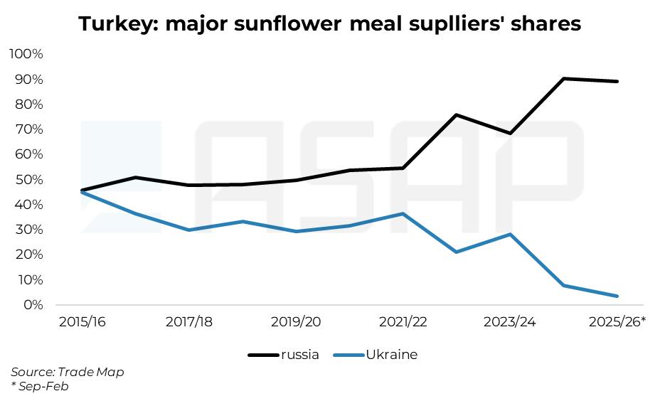 Водночас для Росії Туреччина, навпаки, стала одним із ключових ринків збуту. За даними OleoScope, за перші шість місяців 2025/26 МР (вересень–лютий) експорт соняшникового шроту з Росії склав близько 1,01 млн т, з яких 312 тис. т припали саме на Туреччину.