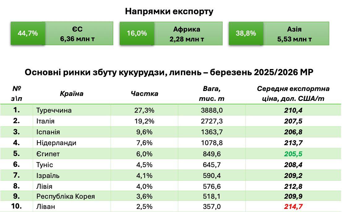 Основними покупцями кукурудзи залишаються Туреччина, Італія та Іспанія, а в регіональному розрізі майже половина експорту припадає на ЄС (44,7%), ще 38,8% — на Азію і 16% — на країни Африки.