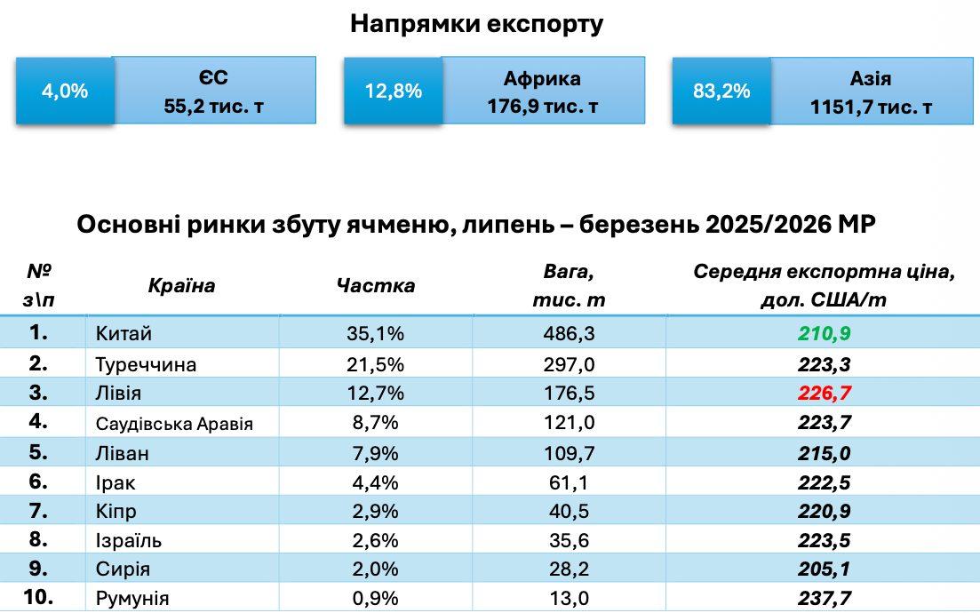 Експорт ячменю, навпаки, демонстрував спад протягом усього сезону. Після відносно активних поставок улітку та на початку осені обсяги різко скоротилися і в зимові місяці опускалися до мінімальних значень. Лише в березні зафіксовано незначне відновлення. Основним напрямком збуту ячменю стала Азія, зокрема Китай, на який припадає понад третина експорту.