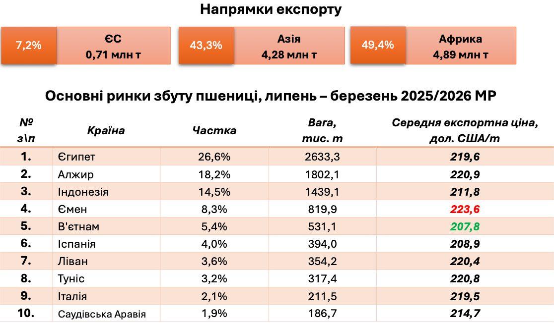 Головними ринками збуту пшениці стали країни Африки та Азії. Зокрема, Єгипет, Алжир та Індонезія забезпечили найбільші обсяги закупівель, тоді як частка ЄС у структурі експорту залишається незначною — близько 7%.