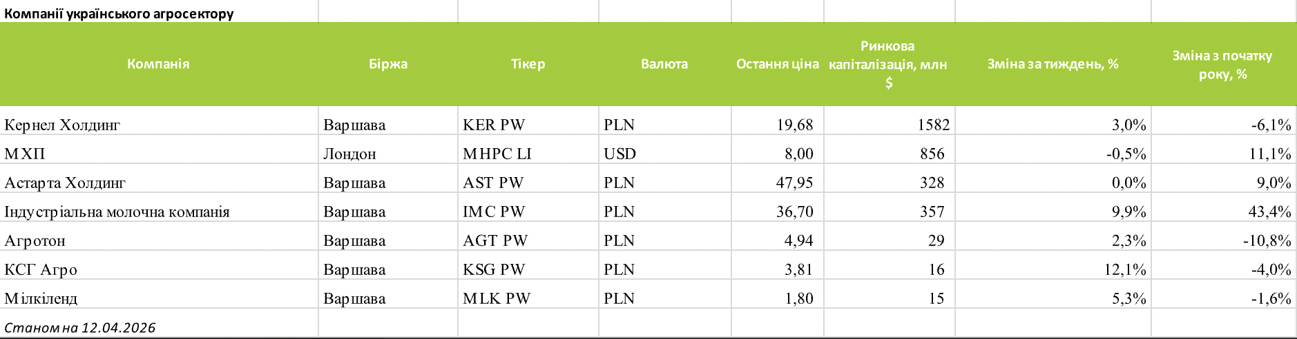 Капіталізація українських агрохолдингів, що торгуються на міжнародних біржах, станом на 12 квітня 2026 року залишається сконцентрованою навколо кількох ключових гравців.