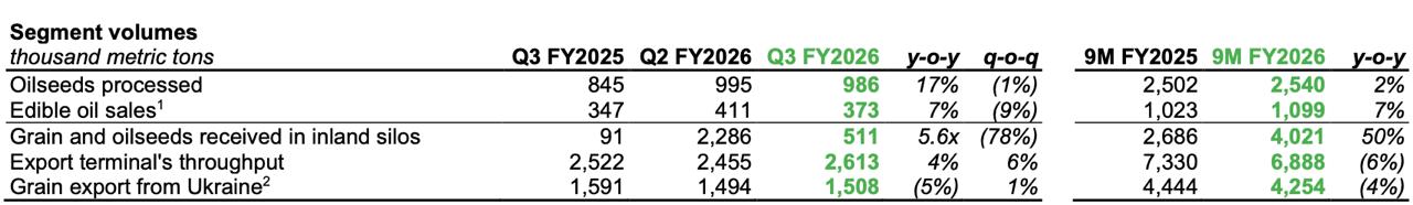 Продажі харчової олії у третьому кварталі 2026 фінансового року склали 373 тис. т (+7% р/р), що відповідає динаміці переробки. З них 19 тис. т припало на бутильовану соняшникову олію.