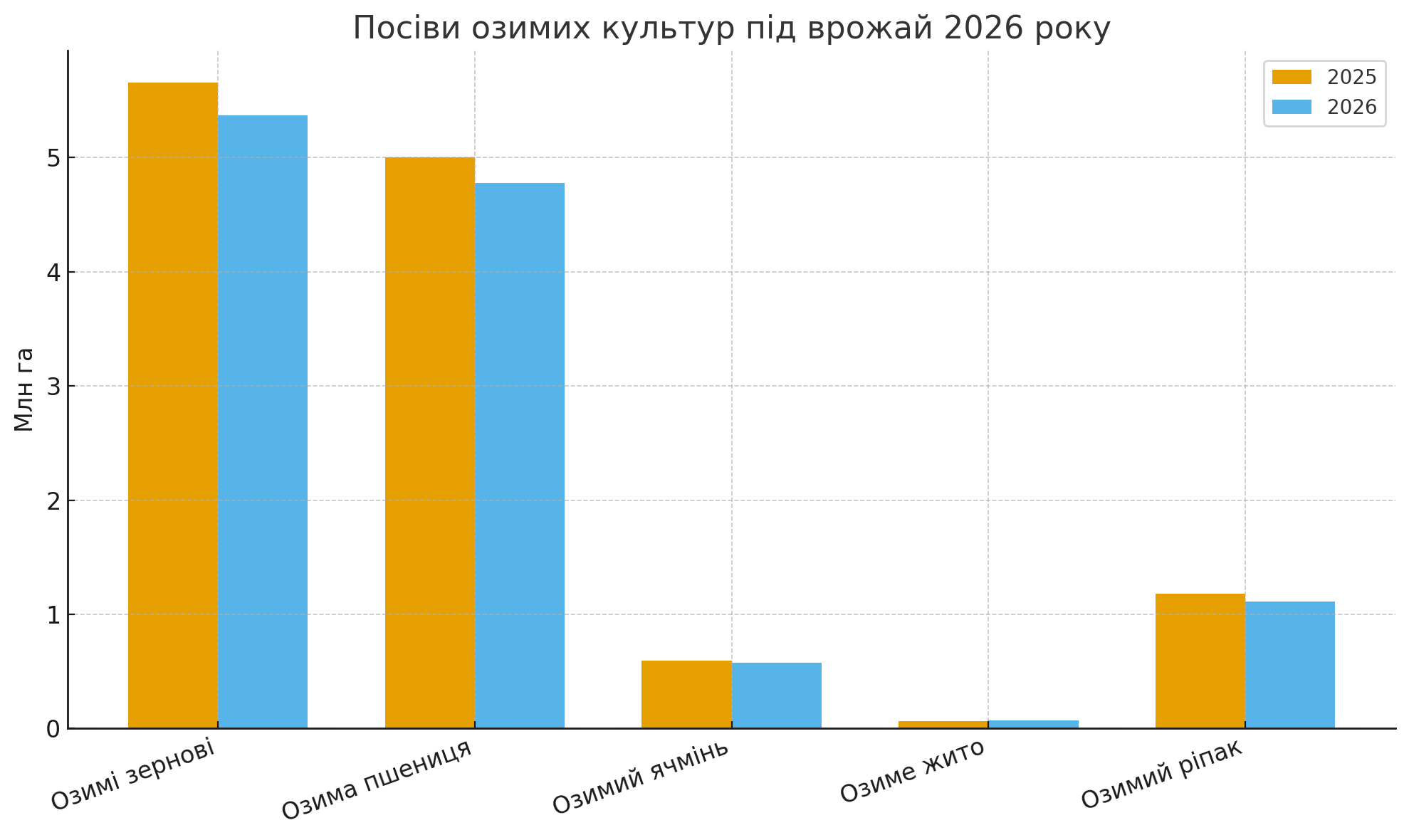 Озимою пшеницею планують засіяти 4778,3 млн га (у 2025 році — 5 млн га), озимим ячменем — 576,1 тис. га проти 592,2 тис. га, а озимим житом — 69,3 тис. га проти 64,4 тис. га. Ріпаком планують засіяти 1,11 млн га, що лише трохи менше, ніж 1,18 млн га торік.