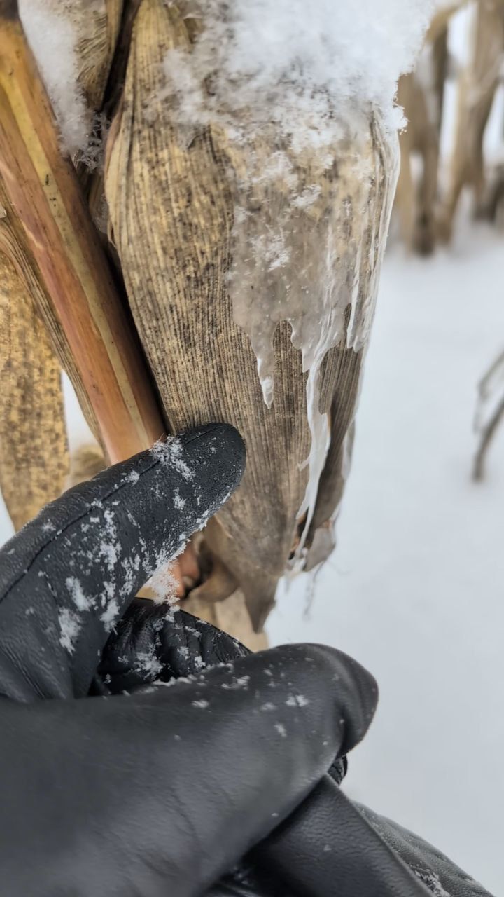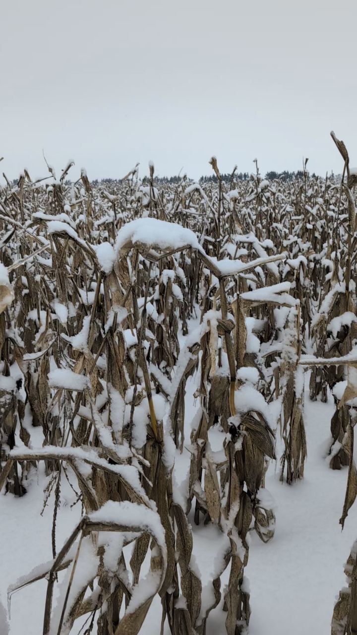 Єдина спроба повноцінно молотити восени була 30 жовтня — тоді зібрали 11 га з вологістю 32–33%, після чого вирішили чекати морозів. Полягання, за словами агронома, немає, кріплення качана — близько 50 см, що дозволило зберегти стояння навіть при снігу до 40 см.