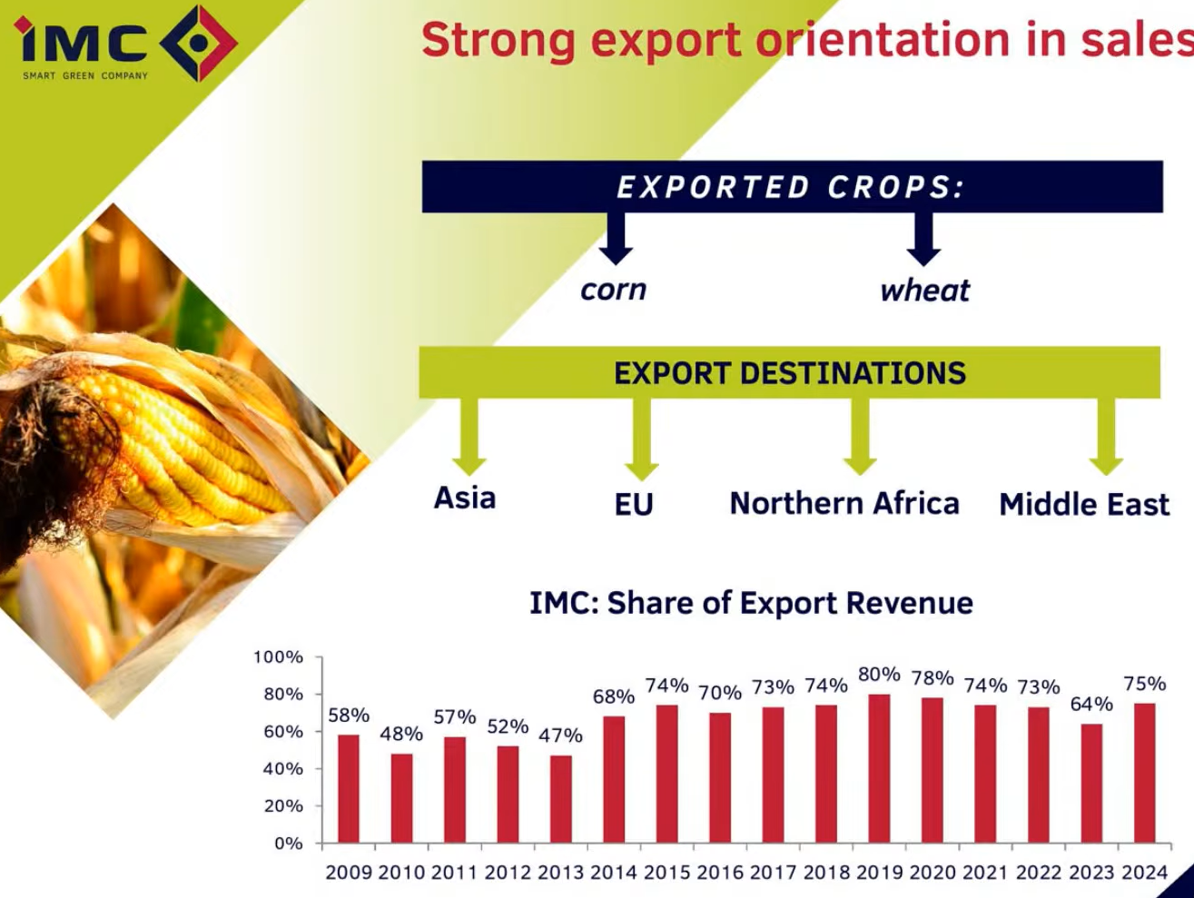 За останні роки компанія стабільно виробляє близько 800 тис. т цих культур. При цьому переважна частина виручки формується за рахунок експорту, наголосив CEO. Наприклад, у 2024 році близько 75% виручки було отримано від експорту, решта 25% — від продажу соняшнику.